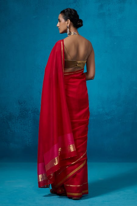 Buy_Dressfolk_Red Chanderi Zari Striped Pre-draped Saree Set With Running Blouse