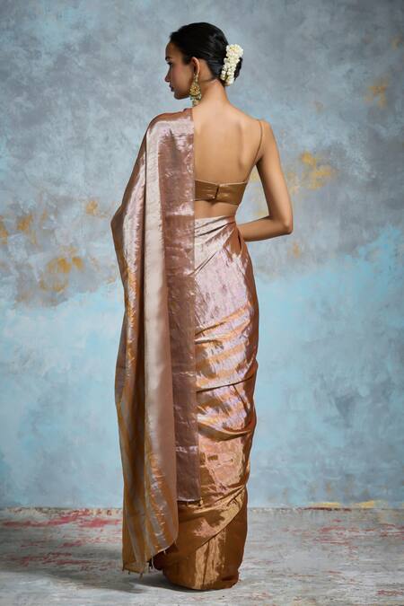 Two-tone handwoven metallic saree featuring contrast stripes and bead tassels on the pallu. Comes with an unstitched blouse piece for customization.