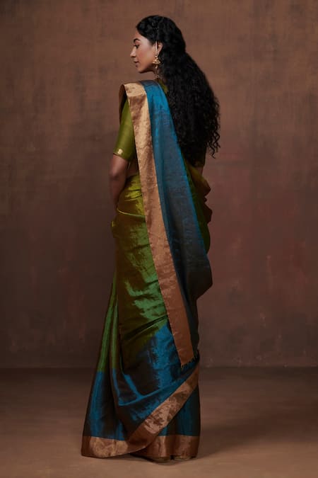 Green and blue handwoven saree crafted in tissue base with color blocking detail. Comes with an unstitched blouse fabric.