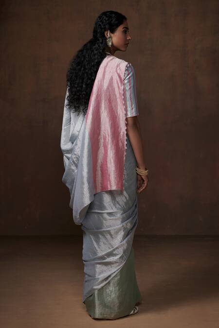 Pastel blue, green & pink handwoven saree crafted in tissue base with gradient detail. Comes with an unstitched blouse fabric.
