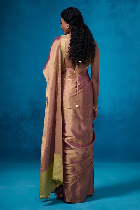 Purple handloom tissue pre-draped saree featuring gold toned zari striped detailing. Paired with a sleeveless blouse in a coordinating color.