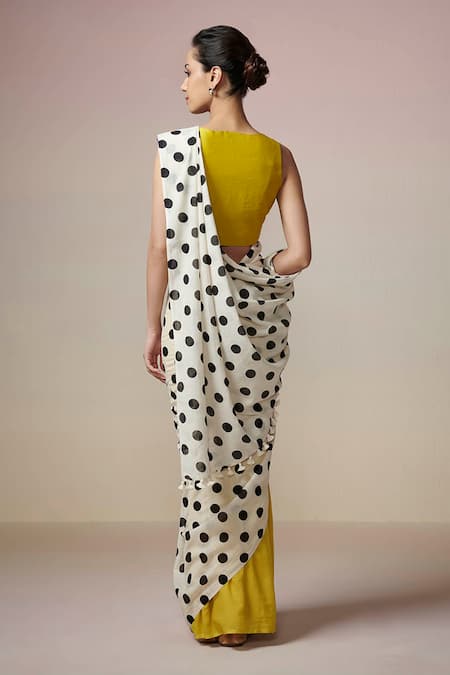 Yellow and white handloom cotton saree featuring polka dot patterns. Paired with a non-padded blouse in a matching yellow shade.