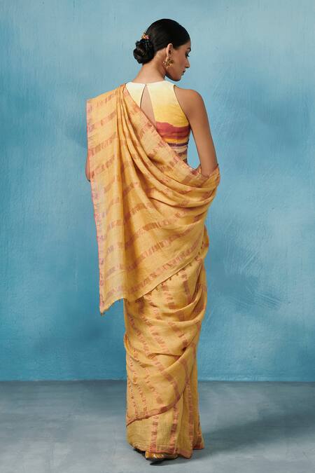 Yellow handloom linen saree with an attached blouse. The saree features a length of 5.5 meters and a width of 44 inches.