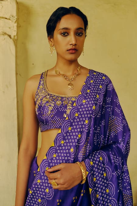 Purple saree in dupion silk featuring all over bandhani print. Paired with a sleeveless padded blouse adorned with floral aari, sequins, gota, dori, anchor & zardozi embellishments.