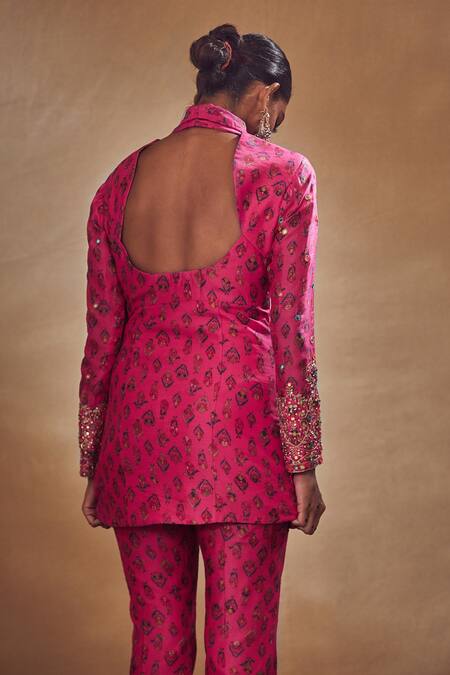 Fuchsia jacket style tunic with floral print, embroidered cuffs and back cutout. Comes with bell bottom pants.