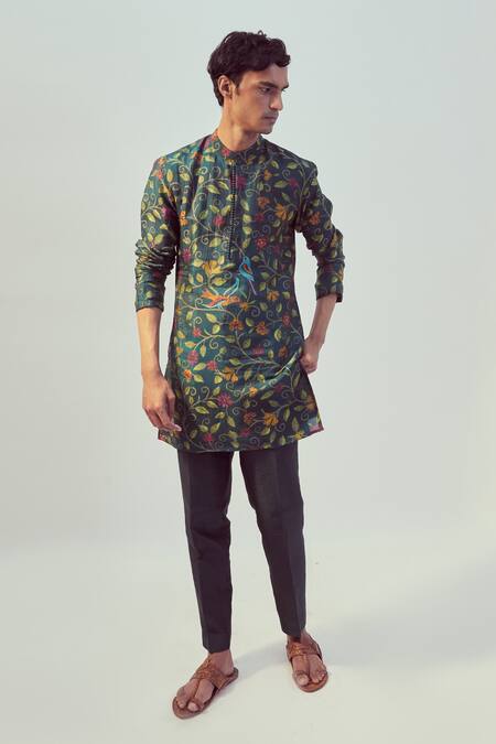 Dark green short woven kurta featuring printed floral motifs. Paired with straight pant.