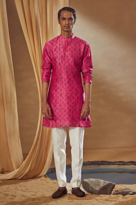 Fuchsia Kurta Dupion , Lining Cotton, Pant Chanderi Print And Set