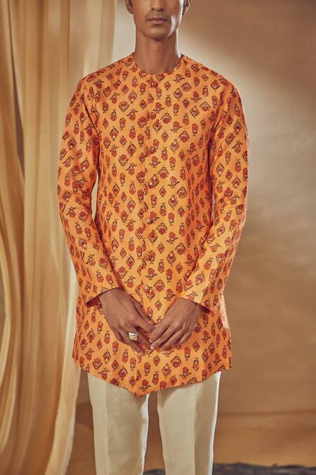 Peach short kurta with floral prints. Comes with straight pant.