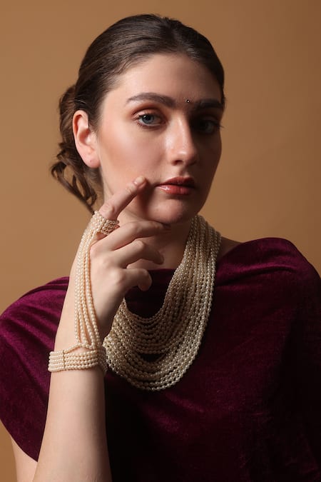 Multiple layered strands of pearls in cream color., Adjustable chain for customizable length.