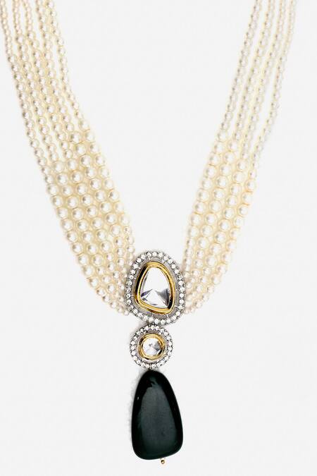 Kundan droplet centerpiece, American diamond accents, Multiple layers of pearl strings