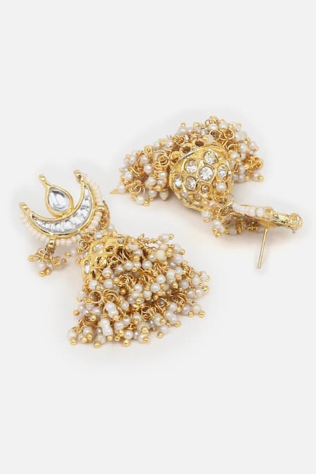 Gold plated jhumkas featuring intricate kundan and pearl embellishments