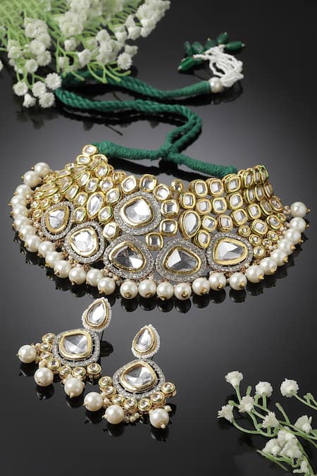 Gold plated choker featuring green, white kundan, american diamond, and pearl embellishments with bead drops. Paired with matching earrings.
