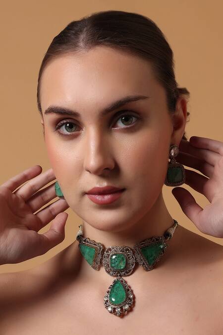 Gold plated necklace with moissanite, american diamond, natural stones embellishments. Paired with a pair of drop earrings.