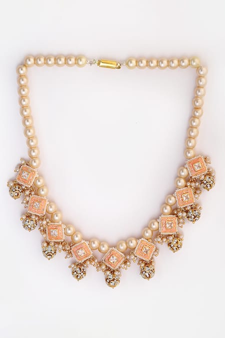 Kundan embellished geometric center patterns, Natural stones integrated into design, Pearl side chain for added elegance