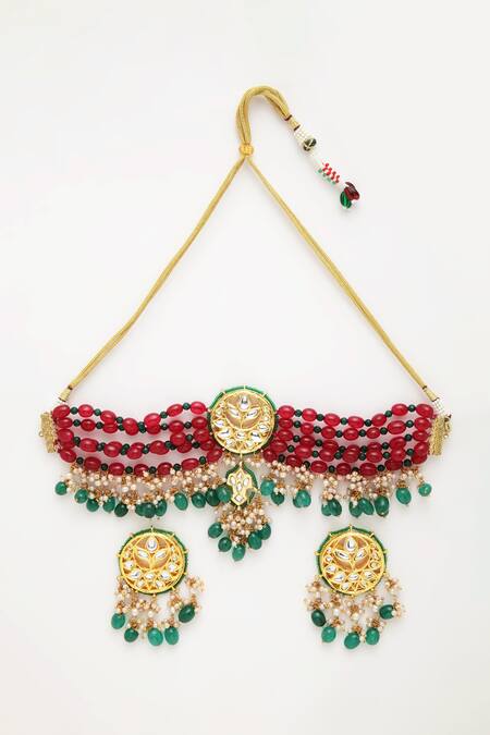 Red alloy necklace featuring gold-plated detailing and green embellishments. Paired with matching earrings adorned with similar gold-plated motifs and green accents.