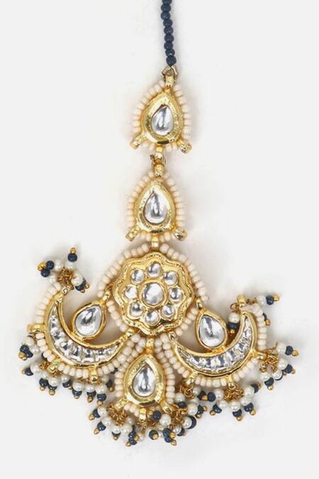 Gold plated maangtikka featuring floral and chaand motifs with kundan, pearls, and natural stone embellishments