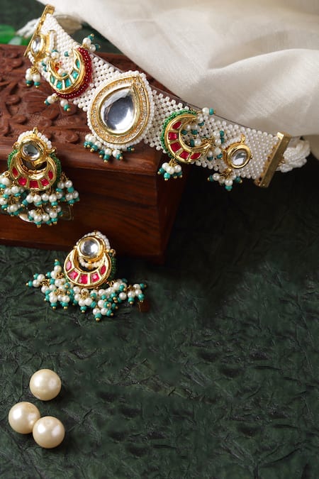 Multi color designer choker featuring pearl beaded jaali pattern, red & green chand brooches, and kundan motifs. Paired with matching chand earrings adorned with pearls, American diamonds, and natural gemstone embellishments.