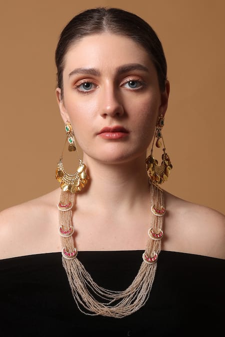 Adjustable dori for customizable fitting, Layered design with multiple strands, Incorporates Kundan and natural stones