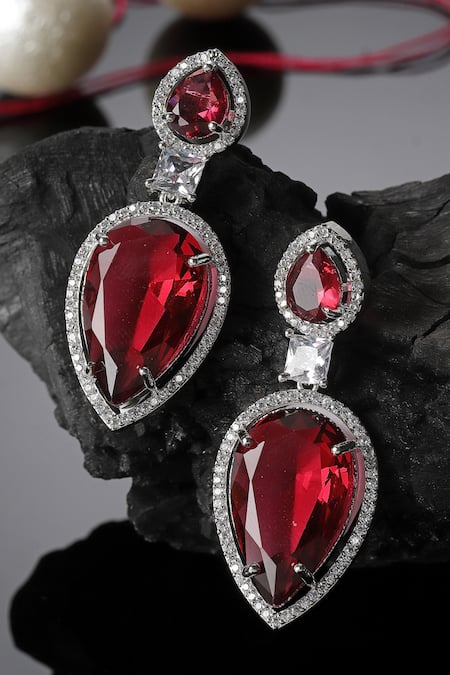 Silver plated earrings featuring ruby red and white double lined design with American diamonds and natural stone embellishments