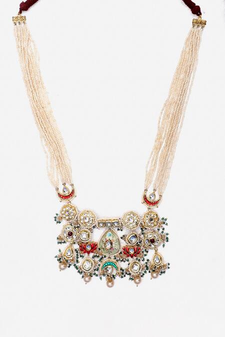 Gold plated red chaand & lotus motif, Green meenakari teardrop design, Multiple strands of pearls and natural stones