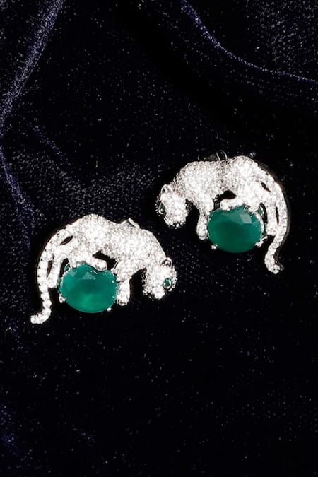 Silver plated jaguar shaped stud earrings featuring American diamond, faux emerald, and natural stone embellishments