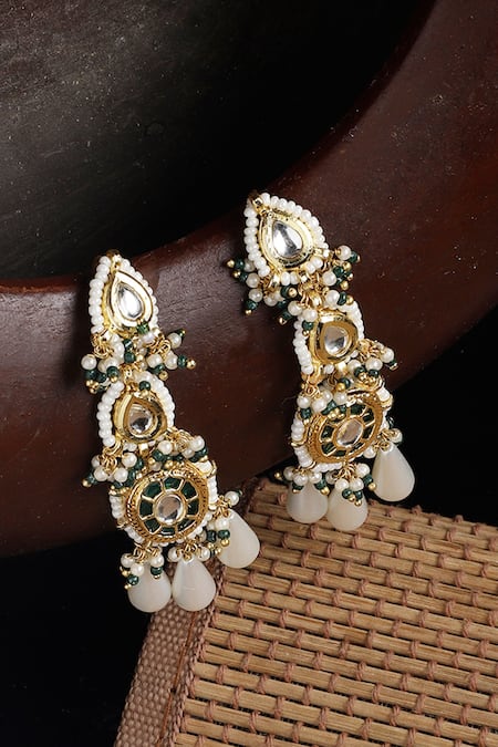 Gold plated long earrings featuring white kundan, pearls, and faux emerald embellishments. Adorned with green natural stones and intricate designs, these earrings are perfect for a statement look.