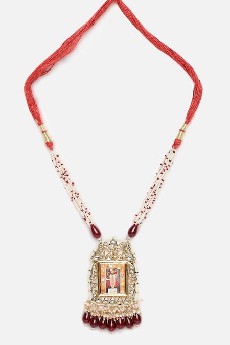 Gold plated temple necklace featuring intricate deity carvings at the center. Embellished with kundan, pearls, and natural stones in green, red, gold, cream, and white tones.