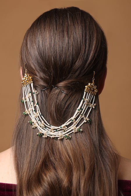 Gold-plated braid pin featuring Kundan, pearls, and faux ruby embellishments