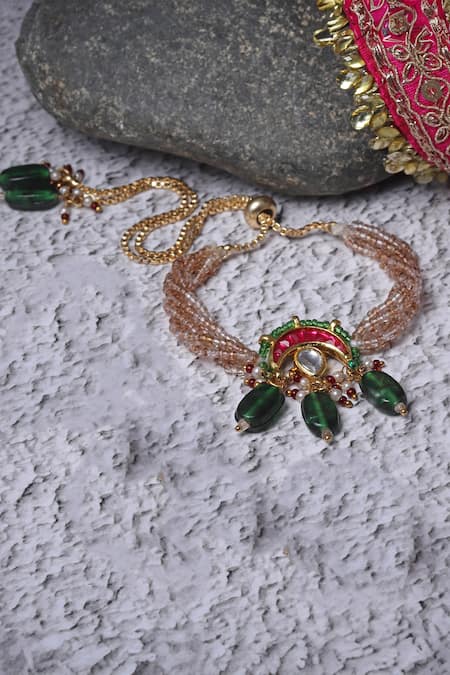 Multi-chain design with half moon patterns, Embellished with faux emerald and natural stones, Pearl bead tassels for added elegance