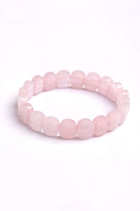 Pink and white elasticated bracelet featuring oval-shaped natural cutting stones.