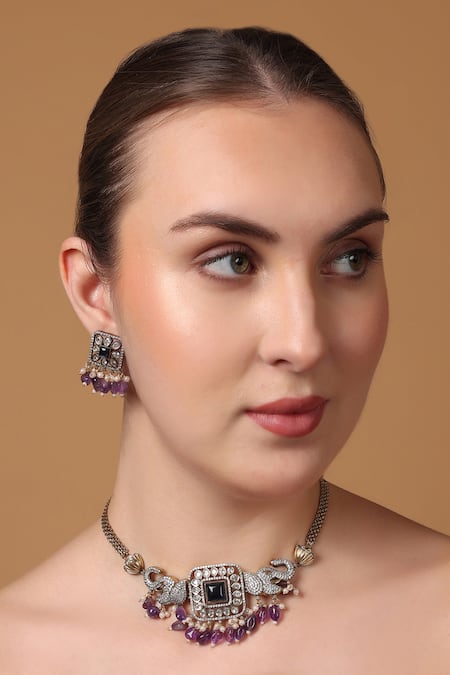 Buy_Dugran By Dugristyle_Multi Color Pearls, Natural Jamuni Elephant Crest Design Choker Necklace Set _at_Aza_Fashions