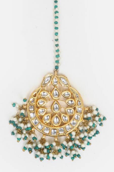 Gold plated maangtikka featuring a center chaand motif adorned with green hued natural stones, kundan, and pearl embellishments