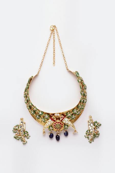 Gold plated choker featuring a bird motif, encrusted with kundans, pearls, and natural stones. Paired with matching bird motif earrings.