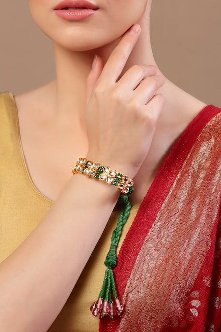 Gold plated bracelet featuring kundan encrusted floral motifs with tassel detailing