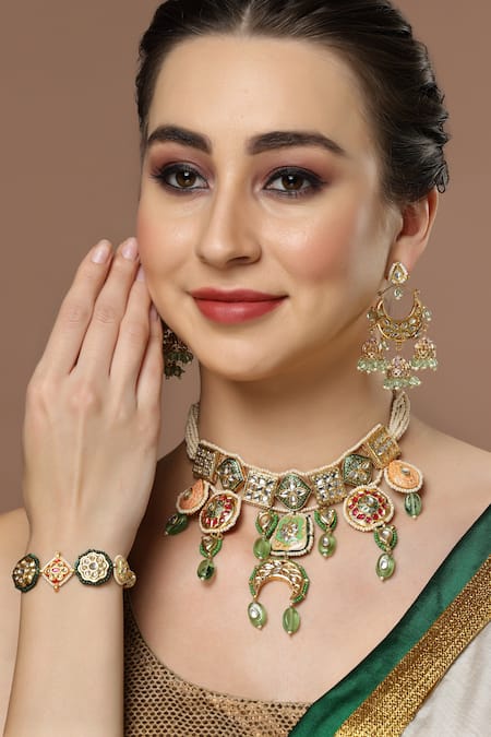 Embellished with white kundan stones, Green bead accents, Intricate jhumka design