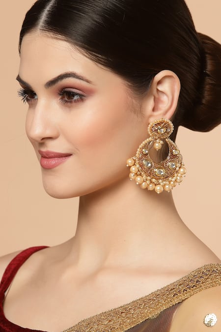 Gold plated chandbalis featuring intricate kundan embellishments and pearl drops
