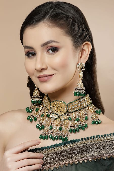 Green bead drops on earrings, Intricate Kundan detailing on necklace, Gold plating with natural stones