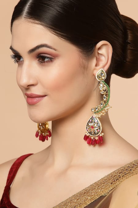 Intricate kundan work with a floral motif, Vibrant blue meenakari detailing, Red bead drops enhancing the design