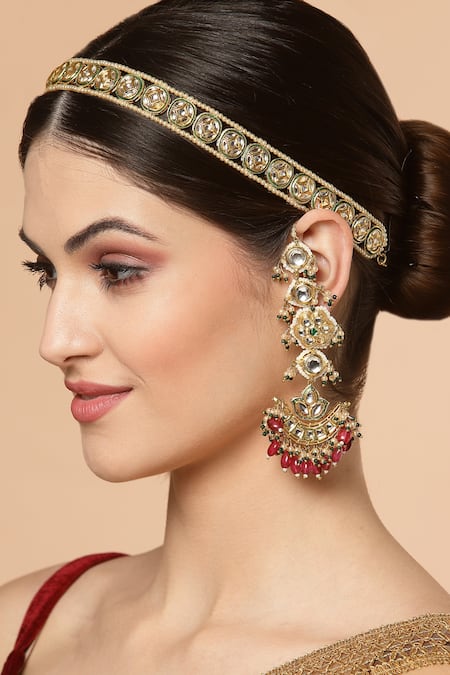 Kundan embellishments with pearl highlights, Red bead drops for added flair, Includes a stylish ear chain