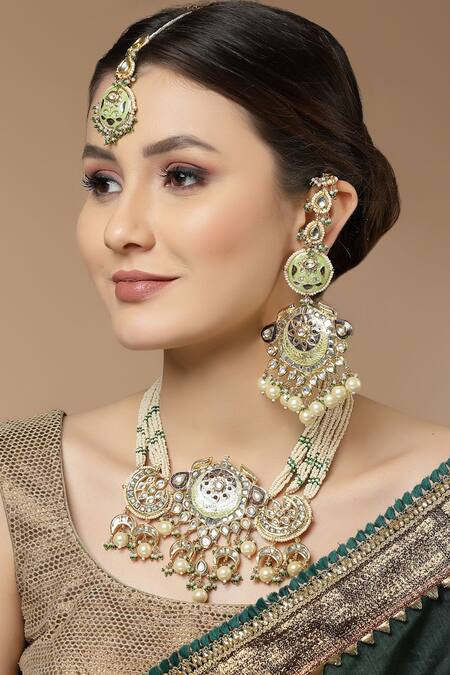 Green meenakari work with kundan embellishments, Bead drops for added elegance
