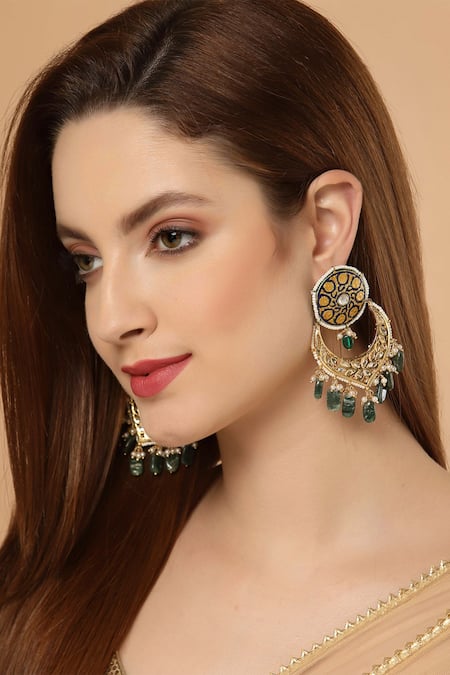 Round blue enamelled top with floral motifs, Moon-shaped drop with kundan and pearl embellishments, Dangling natural stone drops