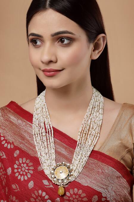 Multi-strand layered pearl chain, Circular floral pendant with kundan & natural stone embellishments, Teardrop natural stone dangle