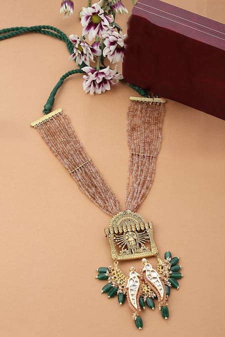 Gold plated long necklace featuring a Lord Vishnu Shastra carved pendant with love birds ornamentation
