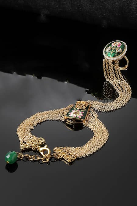 Gold plated multi chained hathphool featuring a green meenakari motif and a circular ring