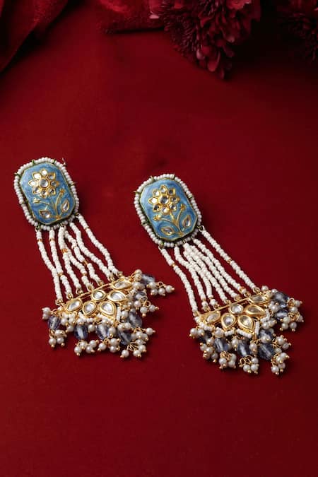 Gold plated chandelier earrings featuring blue floral meenakari work and white kundan embellishments