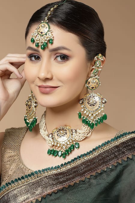 Peach meenakari work, Green bead drops, Kundan embellishment