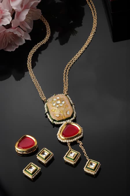 Gold plated long necklace featuring a layered geometric motif pendant with peach floral meenakari work