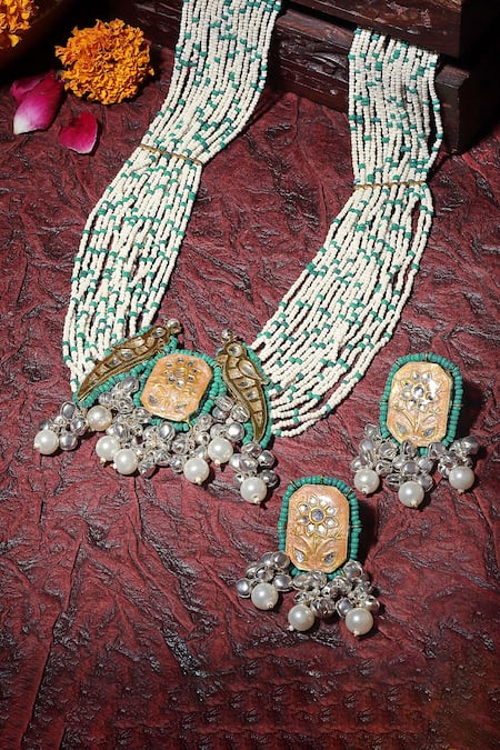 Green Pearls, Fabric Flowers, Stones Natural Embellished Choker Necklace Set