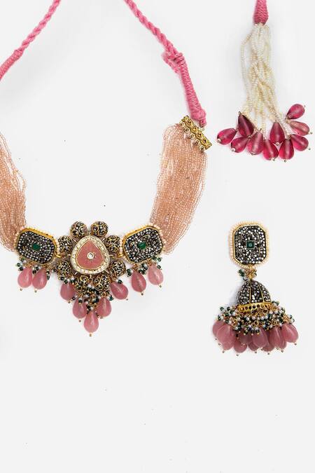 Gold plated Noor choker necklace featuring pink toned natural stones, kundan & American diamond embellishments. Paired with a matching pair of jhumkas designed with intricate detailing and natural stones.