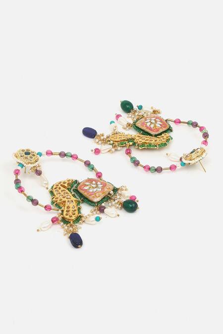 Multi color earrings featuring gold plated peacock motif with kundan, pearl, and natural stone embellishments